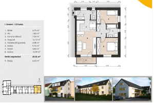A meghirdetett 1. emeleten található 60,56 nm-es ingatlanban amerikai konyhás nappali, 2 szoba, fürdőszoba, külön WC, gardrób, előtér kerül kialakításra. A nappaliból 4,64 nm-es erkély nyílik.