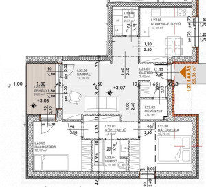A meghirdetett 1. emeleten található 65,16 nm-es lakásban konyha-étkező, nappali, 2 szoba, fürdőszoba, külön WC, közlekedő, gépészet és előtér található. Nappaliból 5,49 nm-es terasz nyílik.