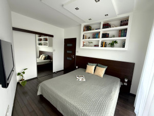 A kényelmes otthonba lépve egy tágas előtérbe érünk, ahonnan az amerikai konyhás nappali tárul elénk. A nappaliból a zárt, parkosított, hatalmas zöld udvarra néző fedett 4,67 m²-es erkély nyílik, amely tökéletes helyszín egy reggeli kávézásra vagy esti kikapcsolódásra. Nappalit az egyedi gipszkarton polcok teszik hangulatossá. A konyha beépített gépekkel (sütő, főzőlap, mikró, elszívó, hűtő) felszerelt. A nappali és a konyha spot világítással rendelkezik. A közlekedőből elérhető 2 szoba és a hálószoba, melyből egy praktikus kialakítású gardrób nyílik. Az asztalos által készített gardróbszekrény megfelelő helyet biztosít a ruháknak és a cipőknek. Az egyik szoba és a hálószoba egyedi gipszkarton polcos rendszerrel rendelkezik, továbbá a hálószobában spot lámpák biztosítják a világítást. A fürdőszobában kád, dupla mosdó, WC található. A közlekedőből nyílik egy vendég WC. A folyosón az előtér mellett helyet kapott egy egyedi, asztalos által készített hatalmas beépített szekrény, melyben külön szekrényrészek vannak kialakítva a praktikus és könnyebb tárolás érdekében.