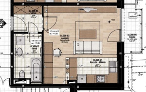 A meghirdetett 3. emeleten található 38,96 nm-es lakásban amerikai konyhás nappali, fürdőszoba, előtér található. A nappaliból 4,82 nm-es loggia nyílik.